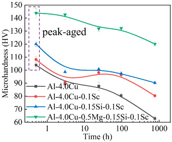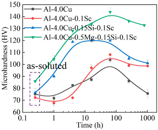 The two-step solution treatment process for all the samples was carried out as follows. Firstly, the samples were kept at 505 °C for 12 h and then heated to 540 °C and kept at that temperature for 5 h; finally, they were quickly cooled using water cooling. The samples were isothermally aged at 175 °C. Thermal stability was tested using thermal exposure at 225 °C for samples that had undergone peak aging at 175 °C. The age–hardening responses (mechanical properties) were characterized using a microhardness tester with a 200 g load and 10 s dwell time. The average of the five hardness values was calculated as the hardness level of samples in a certain state.