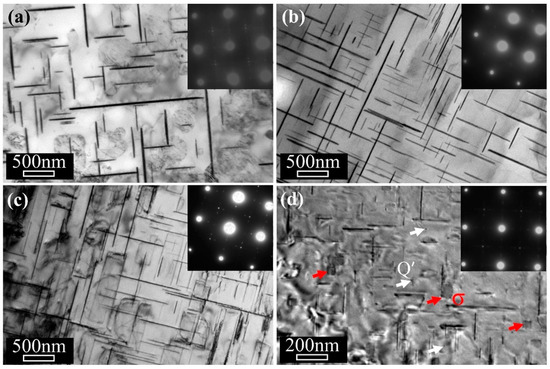 Figure 4 reports the microstructures of all studied alloys after being thermally exposed at 225 °C for ~800 h, and microstructural images are also recorded from <100>Al. After being thermally exposed at 225 °C, the coarsening of θ′ phases in alloy 1# is the most severe, and the number density of θ′ phases is the lowest in alloy 1#. It can be seen from Figure 4b that there are many finer θ′ phases in alloy 2# and the number density of θ′ phases is significantly greater than that in alloy 1#. The coarsening degree of θ′ phases in alloy 3# is lower than that in alloy 2#. It is surprising that almost no coarsening occurs in alloy 4#. Simultaneously, Q′ phases and some cubic σ phases are clearly visible and without coarsening, especially for σ phases in Figure 4d.