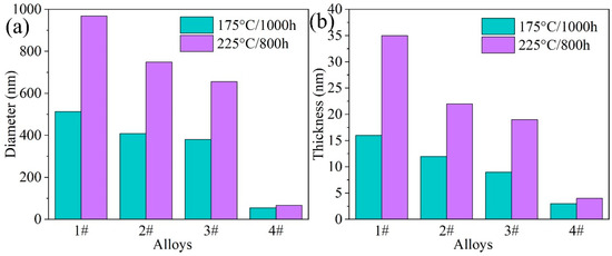 The average size of θ′ phases after isothermal aging (175 °C/~1000 h) and thermal exposure (225 °C/~800 h), respectively. (a) diameter; (b) thickness.