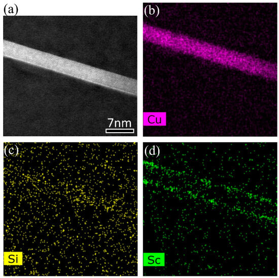 In order to further reveal the reason of the size evolution of the θ′ precipitates in all studied alloys, the distribution of elements in the θ′ phases are characterized (element mappings are also acquired from <100>Al and the Al element is not shown here). Figure 6 shows element distribution of the θ′ precipitates in alloy 3# after being thermally exposed (225 °C/~800 h). As shown in Figure 6b,d, in addition to detecting the segregation of Cu in θ′ precipitates, which is well known, the Sc atoms are conspicuously segregated at the interface of θ′/Al and the segregation of Si is faintly visible in Figure 6c. Alloy 1# does not contain Sc; thus, Sc segregation is the most fundamental reason for enhancing the thermostability of the θ′ phases in alloys 2# and 3# (Sc segregation has also been observed in alloy 2# and not shown here). In the literature [6,18,19], Si segregation like Sc was also observed by means of three-dimensional atomic probe (3DAP) and transmission electron microscopy (TEM) in Al-Cu-Si-Fe-Sc alloys; however, the researchers believe that the segregation of Si with low interfacial excess has only a little effect on the inhibition of θ′ phase coarsening. Because the Si distribution tends to spread out spatially around the interface [6], the main role of Si is to work as a facilitation element to attract Sc into the θ′ precipitates. The size difference of the θ′ phase in alloys 2# and 3# is small. In this paper, our experimental results also agree well with their conjecture.