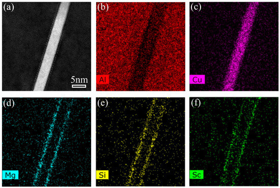 Element distribution of θ′ precipitates in alloy 4# (175 °C/~1000 h) (recorded along the <001>Al). (a) θ′ precipitate, (b) Al, (c) Cu, (d) Mg, (e) Si, (f) Sc.