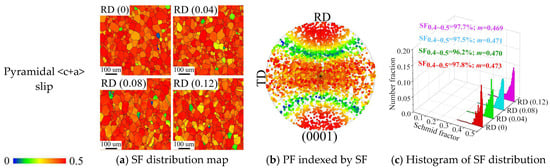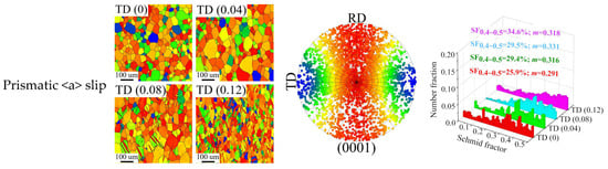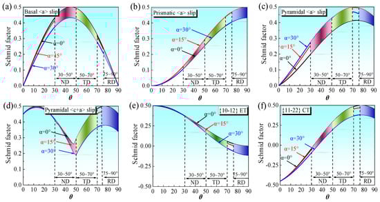 - The special crystal orientation corresponding to the basal bimodal texture affects the activability of each slip system by changing the SF value, and the changes in the type and difficulty of the activated deformation mode lead to the obvious anisotropy of the macro- and micro- deformation characteristics of the rolled titanium plate. The angle θ between the loading axis and the c-axis mostly influences the variation trend of the SF of each slip system, whereas the angle α between the loading axis projection and the a-axis impacts the value of SF. The theoretical derivation results can well predict the SF value of each slip system under different loading conditions;