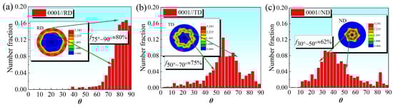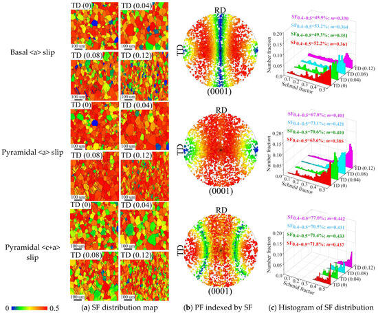 - The tilt angle θb of the grain c-axis from ND to TD becomes polarized due to dislocation slip during tensile along RD and TD, but the tilt angle θa of the grain c-axis from ND to RD stays approximately vertical. The SF value of each deformation mode changes with the change of θa during RD tensile, but the change of θa is minor, resulting in the ψ-m values of each deformation mode being almost constant. Since the SF values of each deformation mode change mainly with the change of θb during TD tensile, the discrete character of the SF values of each deformation mode results from the broad range of θb;