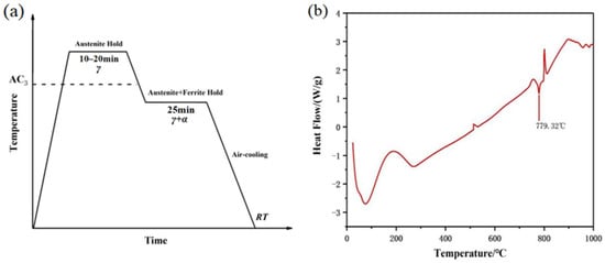After rolling, the steel plates were cooled first to 600–650 °C using a laminar flow and then to 25 °C at a cooling rate of 10 °C/h. Finally, the steel plates were cut into smaller pieces for heat treatment. The austenite transition temperature (Ac1) was measured via differential scanning calorimetry (DSC). Differential Scanning Calorimetry (DSC) was used to examine the thermal properties of a 20–50 mg sample in an Al2O3 crucible and it was tested from 25 to 1000 °C at a heating rate of 5 °C/min under 400 sccm of Ar flow. The utilised heat treatment schedule is shown in Figure 1a. According to this schedule, six groups of materials were first heated to 15, 30, and 45 °C above the austenite transition temperature for 10 and 20 min, then cooled to 25 °C below the austenite transition point for 25 min at a rate of 20 °C/min, and finally air-cooled to room temperature. The austenite transition temperature measured by DSC was 794 °C (Figure 1b). The resulting series of the heat-treated samples were abbreviated 809-10, 809-20, 824-10, 824-20, 839-10, and 839-20, respectively.