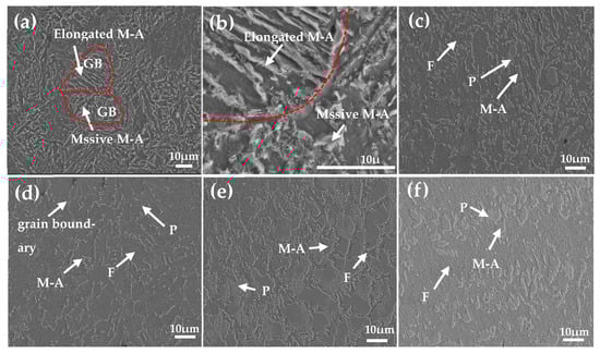 The microstructures of the four typical heat-treated samples are shown in Figure 2c–f. In the obtained SEM images, the dark regions depicted as large blocked structures correspond to the ferrite phase, and the light regions represent M–A constituents with island structures. Lamellar pearlite species surround the edges of M–A islands, and grain boundaries are distributed over the bulk ferrite phase (Figure 2c). After the austenitisation time was extended to 20 min, the M–A particles became smaller, and their volume fraction decreased; however, the austenite grain boundaries became more pronounced (Figure 2d). Pearlite particles were distributed around the blocked ferrites which grew along the austenitic grain boundaries. The amount of the pearlite phase is related to the austenite content and hold time in the α+β tow-phase region, which affects the austenite transformation into ferrite and pearlite [1]. A higher temperature is conducive to austenite formation at the initial stage of the heat treatment; therefore, the pearlite amount increases in Figure 2e,f.