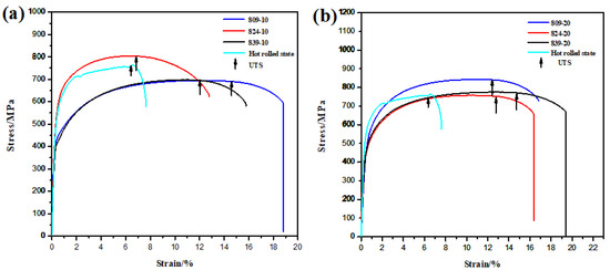 The results of uniaxial tests; (a) the strain–stress curve of the hot-rolled, 809-10, 824-10, and 839-10 samples; (b) the strain–stress curve of the hot-rolled, 809-20, 824-20, and 839-20 samples.
