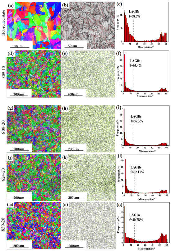 Inverse pole figures, grain boundary distribution maps, and grain boundary misorientation distribution maps for the hot-rolled and heat-treated samples, (a–c) hot-rolled sample, (d–f) 809-10, (g–i) 809-20, (j–l) 824-20, and (m–o) 839-20.