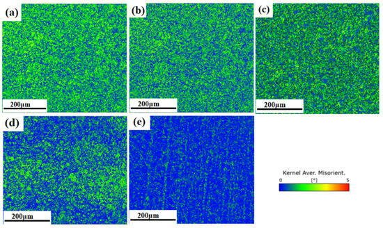 Kernel average misorientation maps of the samples, (a) hot-rolled sample, (b) 809-10 (c) 809-20, (d) 824-10, and (e) 838-20.