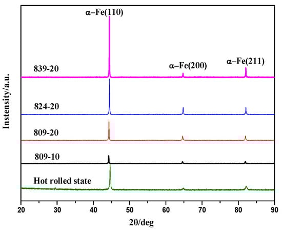 Generally, an increase in the number of LAGBs indicates an increase in the number of dislocations in steel, which improves the material strength. Owing to the higher austenitisation temperature, the diffusion of carbon and iron atoms proceeded faster, which was favourable for the nucleation and growth of austenite species. Many HAGBs were formed, and dislocations disappeared at the higher phase-transition temperatures. Therefore, after increasing the austenitisation temperature to 824 and 839 °C and holding for 20 min, the amount of LAGBs decreased to 62.11% and 40.78%, respectively (Figure 4l,o). In addition to the 839-20 sample whose proportion of LAGBs was lower than that of the hot-rolled sample, the proportions of LAGBs in the other heat-treated samples were higher than that of the hot-rolled sample, implying that the dislocation density of the 839-20 sample was also high.
