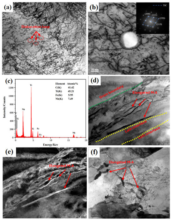 The TEM images of the hot-rolled samples are shown in Figure 7a–e. A dislocation loop is depicted in Figure 7a. Dislocation loops can cause large stress concentrations around the precipitate phase, serving as crack nucleation points and increasing the risk of a brittle fracture in the material [23]. Figure 7b shows that a large number of precipitates with sizes of approximately 10 nm are dispersed in the matrix. A few precipitates with sizes of approximately 110 nm are observed as well. The precipitate particles contain bright cores, and the energy-dispersive X-ray spectroscopy (EDS) pattern suggests that the ratio of Ti to C is approximately 1:1 (Figure 7c). Combined with the fast Fourier transform (FFT) image of the central precipitate region (Figure 7b), the core composition was TiC formed via strain-induced precipitation during rolling. Additionally, numerous elongated M–A islands are present at the lath boundaries (Figure 7d,e). However, in the annealed samples (809-20), these M–A islands become shorter and a few carbides are present (Figure 7f). It can easily be concluded that the shape and characteristics of the M–A constituents and bainitic ferrite are closely linked to the continuous cooling rate, chemical composition, and transformation temperature, which mainly depend on the diffusion of C and Fe atoms [24,25].