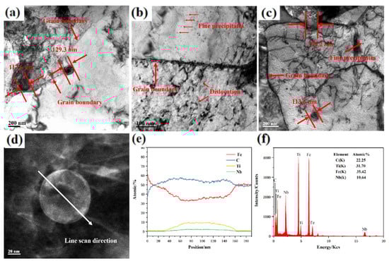 Figure 8d,e displays the line scan direction and results, respectively, which indicate that elements are non-uniformly distributed in the precipitates. In the edge region of the precipitate, the major elements are Fe and C; however, in the middle region of the precipitate, the Ti content increases, while the Fe content decreases, and the C content remains basically unchanged. This indicates that the precipitate exhibits a core–shell structure, in which the Fe–C compound forms the shell, and the Ti–C compound forms the core. It is also suggested that, in the heat treatment process, the Ti–C compound is precipitated earlier than the Fe–C compound because of the lower free energy. A considerable amount of Nb (10.64%) is detected by EDS (Figure 8f); meanwhile, Nb likely increases the strength of the HSLA steel through the precipitation of the second phase [29,30,31].