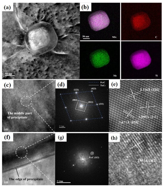 As shown in Figure 9a, the precipitate contains a core. To investigate the elemental distribution of the precipitates, an elemental mapping analysis was performed (Figure 9b), suggesting that C and Ti are mainly concentrated in the core, whereas Nb is uniformly distributed in the precipitate. Figure 9c,f displays the high-resolution transmission electron microscopy (HRTEM) images of the middle and edge regions of the precipitates. Several diffraction points are present in the FFT image in the middle region of the precipitate (Figure 9d), suggesting the existence of at least two phases. According to the line scan results, the phases in the middle region of the precipitate correspond to Fe3C and Ti8C5 species. In the precipitate edge region, only two bright diffraction points are present near the centre, which is significantly different from the middle region. Hence, this region mainly consists of a single phase. The inverse fast Fourier transform (IFFT) image depicted in Figure 9h indicates the existence of only one lattice type with a spacing of approximately 2.403 Å, which confirms the formation of the Fe3C phase in the edge region.