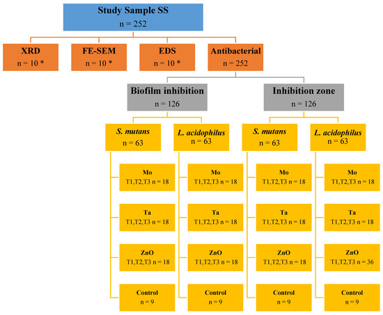 Distribution of the study samples. * The samples used for X-ray diffraction (XRD), field emission scanning electron microscopy (FE-SEM), and energy dispersive X-ray spectrometry (EDX) tests were also used for antibacterial tests.