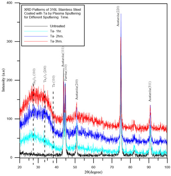 Figure 9 shows the XRD pattern of 316L SS coated with Ta using plasma sputtering under different sputtering time conditions. It can be observed that the untreated SS exhibits a highly crystalline reflection at 2θ 43.7°, 50.85°, 74.7°, and 90.7°, which can be assigned to (111), (200), (220), and (311) face-centered cubic austenite phases (PDF # ICDD14-0529). Moreover, a (110) body-centered cubic ferrite phase can be observed at 2θ 44.6° (PDF # ICDD 006-0696).