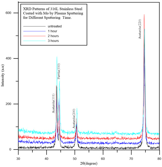 XRD pattern of 316L stainless steel Mo coated using plasma sputtering under different sputtering time conditions.