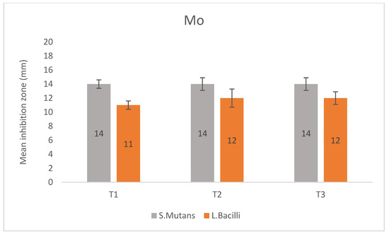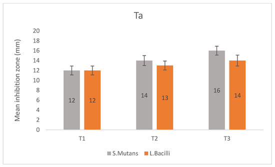 The comparison of the inhibition zone for S. mutans with Mo showed no significant difference, while for L. acidophilus it was significantly lower in T1 than in T2 and T3 (Figure 14). The comparison of the inhibition zone for S. mutans with Ta was significantly lower in T1 than in T2 and T3, while for L. acidophilus it was significantly lower in T1 compared to T3 only (Figure 15). The comparison of the inhibition zone with ZnO according to the type of bacteria was significant for T1, T2 and T3 (p < 0.05). The comparison of the inhibition zone for S. mutans and L. acidophilus with ZnO was significantly higher for T3 than for T1 and T2. The inhibition zone was shown to increase with increasing sputtering time (Figure 16).