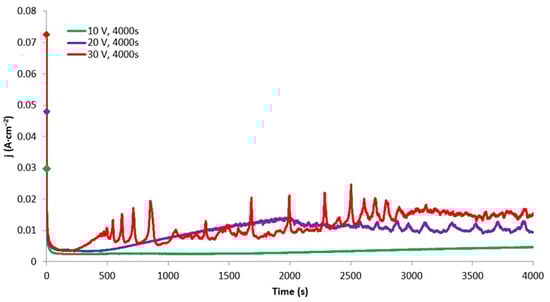 Different anodization potentials were used to evaluate the best anodization potential for additively manufactured Ti6Al4V coupons. Potentials of 10 V, 20 V, and 30 V were tested, maintaining at this stage a synthesis time of 4000 s. Since a two-electrode configuration was used, the potential applied corresponds to the difference between the working electrode (Ti6Al4V) and the counter electrode (Pt mesh). The distance was maintained at 3 mm to reduce electrical resistance in the cell and facilitate the electron transfer. Figure 1 shows the chronoamperograms obtained during the anodization. In all the chronoamperograms, an initial large current density was observed, which is attributed to the initial oxide layer formation due to the applied potential and the oxidation of Ti to Ti4+. The initial currents obtained after applying the anodization potential were 30 mA·cm−2, 48 mA·cm−2, and 73 mA·cm−2 for 10 V, 20 V, and 30 V, respectively. The initial current density increases with potential as does the thickness of the oxide layer formed. The current density rapidly decreases due to the formation of titanium dioxide via hydrolysis reaction [45] (Reaction (1)).