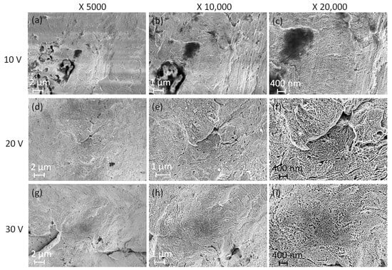 HRFESEM was used to analyze the morphology of the samples obtained and select the best anodization potential based on the morphology observed. Figure 2 compares the micrographs at different magnifications (×5000, ×10,000, ×20,000) for the samples obtained at 10 V, 20 V, and 30 V. As can be seen at these magnifications, the anodization of the surface was general and not localized. At ×10,000 and ×20,000 magnification, the nanostructure of the anodized layer began to be observed and the finest nanostructure was obtained at 10 V.