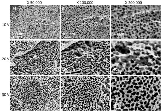 The morphology of the nanostructures can be best evaluated when higher magnification was used (Figure 3), where ×50,000, ×100,000, and ×200,000 magnification was used. At 10 V, a homogeneous distribution of individual nanopores of 15–20 nm over the entire surface was obtained. Similar morphology has been reported in the literature [49]. At 20 V, the size of the nanopores increased to 25–40 nm and some of them joined together. At 30 V, the same happened, and some nanopores fused together and similar nanopore sizes were obtained. In general, an increase in the potential produces and increase in the nanopore/nanotube size [50]. Hence, the most adequate potential for anodizing was 10 V, where the individual nanopores were obtained without fusing together. The results observed by HRFESEM corroborate the ones obtained by the chronoamperograms, which showed a low fluctuation in the current density at 10 V when compared to 20 V and 30 V.