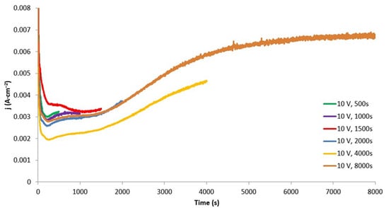 Chronoamperograms of the anodization of Ti6Al4V coupons obtained by additive manufacturing. Anodization potential: 10 V; anodization times: 500 s, 1000 s, 1500 s, 2000 s, 4000 s, and 8000 s; medium: 0.2% NH4F and 1 M (NH4)2SO4.