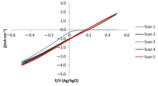 The electrochemical synthesis of NPs involve methods that are widely applied in the literature [51,52] since they offer advantages such an easy control of the process, and the amount of nanomaterial deposited can be easily controlled by the electrical charge applied. Only two studies have previously conducted the electrochemical synthesis of AgNPs on anodized titanium [53,54]. Figure 6 shows the voltametric characterization of anodized Ti6Al4V coupons in a [Ag(NH3)2]+ solution (0.05 M AgNO3 + NH4OH). In the first scan, a cathodic current density increase begins at around 0.1 V and continues until −0.5 V. This decrease can be attributed to the reduction of Ag+ to Ag0. In the following scans, a resistive behavior can be observed, which can be attributed to sluggish electron transfer derived from the poor conductivity of the anodized layer. From the first voltammogram, 0.1 V, 0.05 V, and 0 V potentials were selected to carry out the potentiostatic synthesis of AgNPs.