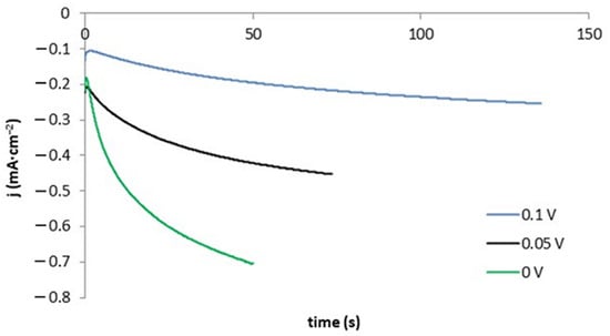 The chronoamperograms of the synthesis of AgNPs on anodized Ti6Al4V coupons in a [Ag(NH3)2]+ solution (0.05 M AgNO3 + NH4OH). Synthesis potentials: 0 V, 0.05 V, 0.1 V. Synthesis charge: −0.1 C.