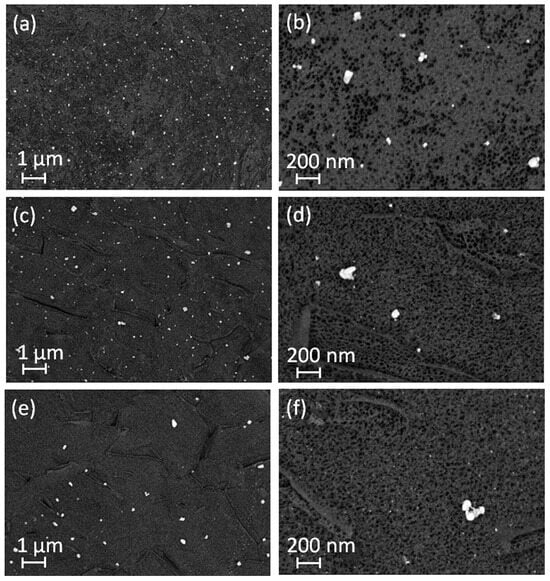 HRFESEM micrographs of Ti6Al4V coupons anodized at 10 V and coated with AgNPs synthesized electrochemically at: (a,b) 0.1 V, (c,d) 0.05 V, and (e,f) 0 V. Magnification: (a,c,e) ×10,000, (b,d,f) ×50,000. Micrographs obtained with backscatter electron detector.