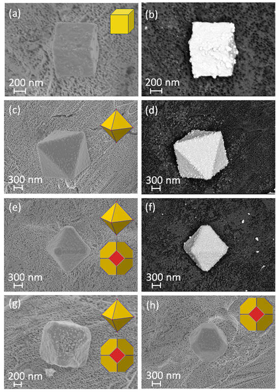 Cubic nanoparticles (Figure 9a,b), octahedron (Figure 9c,d), slightly truncated octahedron (Figure 9e–g), and fully truncated octahedron (face square) (Figure 9h) were observed. These morphologies have been obtained for chemically synthesized AgNPs [56], but have not been reported to be grown electrochemically to the best of our knowledge. The formation of these geometric figures can be attributed to two factors. On one hand, the kinetics of the growth of the AgNPs at 0.1 V (low current density, as shown in Figure 7a) are slow, which allow for an arrangement of the atoms in these geometric forms. The other contributing factor is the poor conductivity of the anodized surface. Once AgNPs begin to be formed, it seems easier to continue the growth of these nanoparticles rather than creating new nucleation points, contributing to the growth of the single crystals [57]. Figure 9b,d,f shows the micrographs obtained with a backscatter electron detector to demonstrate that such polyhedron forms consist of Ag. The polyhedrons appear as white zones, which indicate that they are made from Ag. In addition, some dispersed AgNPs can also be observed on the surface of the anodized coupons.