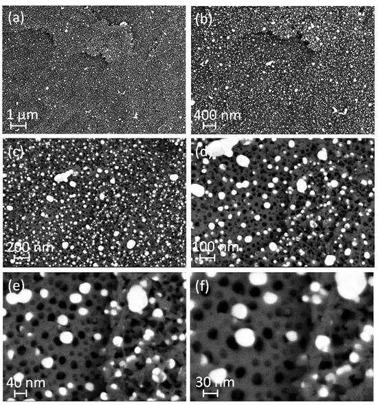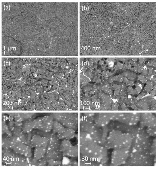 HRFESEM micrographs of Ti6Al4V coupons anodized at 10 V and coated with chemically synthesized AgNPs (drying step applied). Magnification: (a) ×10,000; (b) ×20,000; (c) ×50,000; (d) ×100,000; (e) ×200,000; (f) ×300,000. Micrographs obtained with a backscatter electron detector.