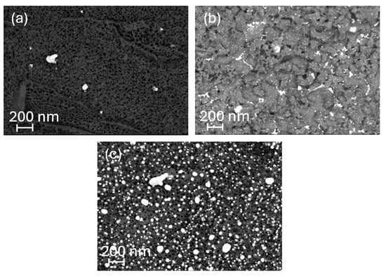 A comparison of the HRFESEM micrographs of Ti6Al4V coupons anodized at 10 V and coated with AgNPs synthesized (a) electrochemically, (b) thermally, (c) chemically (drying step applied). Magnification: ×50,000. Micrographs obtained with a backscatter electron detector.