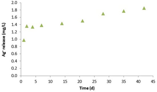 One important aspect is the release kinetics of Ag+ and its concentration (mg/L). Figure 14 shows the cumulated release of Ag+ for 42 days as measured by ICP-MS. A Ag+ release of 1.86 mg Ag+/L was achieved within 42 days. In the first few days, where an infection after the implantation of a prosthetic device is most probable, the Ag+ release was higher than in the following days. The concentration of Ag+ released is not dangerous for human cells, since the potential toxic limit of Ag+ is 10 mg/L [64,65].