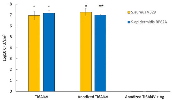 A comparison of bactericidal activity against the S. aureus V329 strain and S. epidermidis RP62A strain of different Ti6Al4V materials. The bars indicate the mean of Log10 (UFC/mL) and error bars correspond to standard deviation. The comparison is produced with t-test by matching anodized Ti6Al4V + AgNPs against the controls (Ti6Al4V and anodized Ti6Al4V). *: p ≤ 0.05 and **: p ≤ 0.01.
