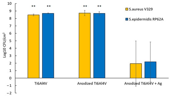 A comparison of the biofilm formation of the S. aureus V329 strain and S. epidermidis RP62A strain on different Ti6Al4V materials. The bars indicate the mean of Log10 (UFC/mL) and error bars correspond to standard deviation. The comparison is produced with t-test by matching anodized Ti6Al4V + AgNPs against the controls (Ti6Al4V and anodized Ti6Al4V). **: p ≤ 0.01.