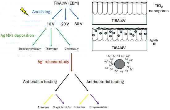 Scheme 1 shows the general plan of experimental work that was carried out. After manufacturing the Ti6Al4V coupons using EBM, anodizing was optimized using three different voltages (10 V, 20 V, and 30 V). Thereafter, AgNPs were deposited on optimal anodized coupons by means of three deposition techniques (electrochemical, thermal, and chemical). The Ag+ released in the simulated body fluid was studied for the optimal coating. Subsequently, antibacterial and antibiofilm characterization was performed for the optimal coating using S. aureus and S. epidermidis bacteria.