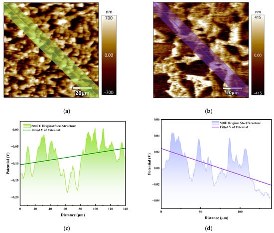(1) Microscopic observation and SKPM detection under identical corrosion conditions reveal distinct differences between 500CE and 500E steels. The 500CE steel, regulated by alloying elements, exhibits finer ferrite grains and a notably lower pearlite content compared to 500E steel. This microstructural composition contributes to a more uniform corrosion process, reducing the risk of catastrophic corrosion failure. The microstructure of 500CE affords it its potential to stabilize at a more positive electrical potential without significant contrasts due to structural differences. Conversely, 500E displays larger grain sizes in its microstructure, with alternating surface potentials relative to the probe and significant absolute potential fluctuations, which may lead to intergranular corrosion. However, its microstructural uniformity and electrochemical activity remain stable.
