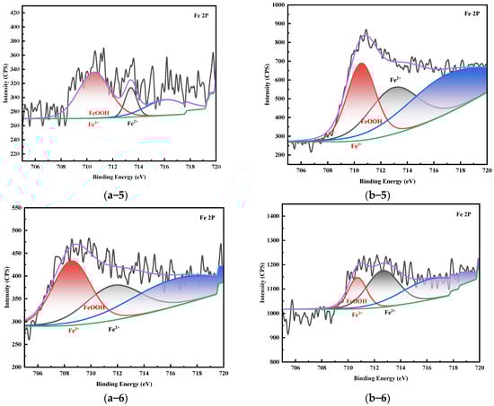 (3) In the early stages of the corrosion of 500CE, the main components of the external layer are FeO, partially oxidized Fe3O4, and small amounts of FeOOH. In the later stages of corrosion, Fe3+ is gradually enriched on the surface, indicating that the Fe2O3 formed on the surface of the 500CE layer is relatively stable and dense, capable of persisting during the corrosion process. In contrast, as corrosion progresses in 500E, the intensity of the Fe2+ peak gradually decreases, suggesting that its oxidation reactions are more severe compared to those of 500CE.
