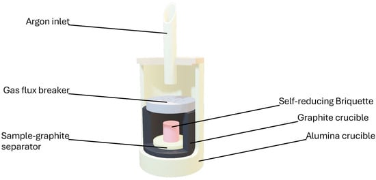 The thermal cycles were carried in a Nabertherm LHT 02/17 LB lift-bottom furnace (Nabertherm, Lilienthal, Germany) in which a crucible containing the sample was inserted. The crucible was made in alumina and, to prevent any interaction with the briquette, a second graphite crucible was used as sample container. Since no variation of mass was observed in the graphite crucible in the experimental trials, it was concluded that it did not affect the results. To ensure an inert atmosphere, an argon flow (10·Nl h−1) was directly blown inside the alumina crucible during the whole treatment duration. Specifically, after a fist maintenance at room temperature of 30 min, required to saturate the crucible volume with argon, the target temperature was reached using a heating rate of 100 °C min−1 and maintained for 15 min; finally, the crucible was naturally cooled down in the oven and extracted below 300 °C. The crucible configuration is given in Figure 1.