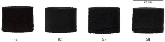 The as-produced briquettes (green) were let dry at room temperature to allow their curing and density stabilization. The visual appearance of the briquettes after 14 days (cured) is shown in Figure 2.
