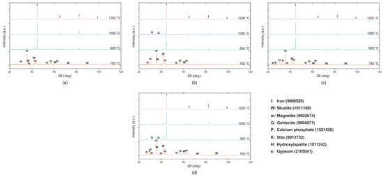 XRD pattern of the (a) MS/WC, (b) MS/OP750, (c) MS/OP350, and (d) MS/HC briquette after heating at 750, 900, 1050, and 1200 °C under Ar atmosphere (DB card number in parenthesis).