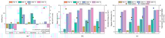 The samples’ swelling, mass loss, and DoR after heating at 750, 900, 1050, and 1200 °C under Ar atmosphere are shown in Figure 4. To better highlight the role of the physicochemical properties of the reducing agents on the metallurgical performance, the percentage of Ctot, volatile matter, and ash present in each recipe as well as the specific activation energy were reported in the graphs, too.