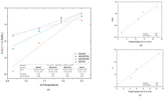 (a) Linearized form plots of the degree of reduction versus temperature, and relationship between (b) the regression constant and volatile matter in the recipe, and (c) the regression curve slope and fixed carbon in the recipe.