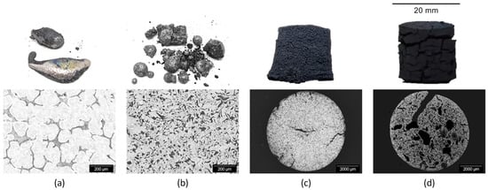 Visual appearance and metallographic analysis of the (a) MS/WC, (b) MS/OP750, (c) MS/OP350, and (d) MS/HC briquettes treated at 1400 °C.