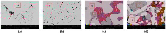 EDS spectra of MS/WC, MS/OP750, MS/OP350, and MS/HC briquettes expressed in wt.% (A–D, C*–D* and a–b spectra are given as average values in the same phase).