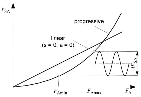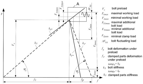The force–displacement diagram displays the theoretical conditions of a preloaded bolt (Figure 2). The symbols and indices for forces and strains are taken from the VDI 2230 guideline [17]. A distinction must be made between the preload and the operating conditions. The dashed line shows the diagram at preload. When the bolt is loaded with a preload FV, it is stretched by fS, and the clamping parts are contracted by fP. The elongation depends on the stiffness of the bolt kS and the stiffness of the clamping parts kP. During operation, when the working load FA is applied to the bolted joint, the load in the bolt is increased, and the load between the clamping parts (sealing force FK) is decreased. In a special case, when the working load is applied at the same point as the preload, the stiffness of the joint during operation is the same as that of the preload. In practise, only part of the clamping parts are relieved, and part of the clamping parts continue to be compressed, contributing to a flatter kS* and a steeper kP* characteristic. In VDI 2230, this effect is taken into account by the load introduction factor. The variation in the working load during operation leads to a variation in the additional bolt load, which is critical for the bolt fatigue. It can be seen from the diagram that the amplitude of the dynamic load on the bolt is reduced if the bolt is less stiff (i.e., more elastic) and the clamping parts are stiffer. Detail A, which shows a variation in the additional load in the bolt, is crucial for analysing the bolt fatigue. This part of the diagram is linear only if the working force is applied along the axis of the bolt, which is very rare in practical applications. In flange joints, the working load is applied eccentrically, and the additional load on the bolt increases progressively due to the additional bending load (on bolt and flange). When dealing with the fatigue of bolts, an increase in the additional bolt load as a function of the working load is usually specified, as shown in Figure 3.