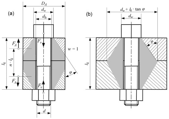 The resilience of clamping parts is the sum of the resilience of individual segments that are subjected to a compressive load. In the case of washers, the shape of a compressively loaded section is a circular ring with a known outer and inner diameter. Therefore, a washer’s resilience can be calculated analytically and accurately. The calculation of the resilience of the flanges is a more difficult problem. Various analytical equations have been derived from numerical analyses, but they do not give exactly the same results. A comparison of different approaches in a practical case is given in [20,21,22]. Several authors [23,24,25,26] described a compression zone with hollow truncated cones (Figure 4). In practise, the Equations (3) and (4), recommended by VDI 2230 [17], are mostly used today. Geometric values for calculating the resilience of coupling parts are indicated in Figure 4. The wrench size is used as the contact diameter dW for hex-head cap bolts, while the head diameter is used as the contact diameter dW for cylindrical-head bolts. The pressure cone angle φ is approximately 30° and varies slightly depending on the joint geometry. The shape of the deformed zone in a nut connection is not the same as in a bolt that is threaded into a structure. This difference is taken into account by a parameter w: w = 1 for the nut connection (example in Figure 4) and w = 2 for the bolt threaded into the structure.