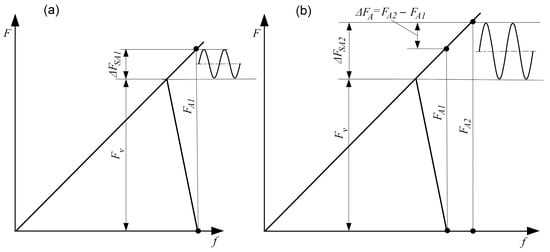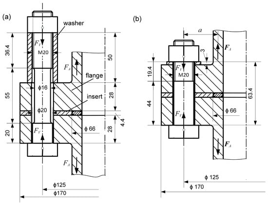In practical applications, the working load usually does not act in the bolt axis and does not act directly under the bolt head. The additional load on the bolt is also influenced by the point of action of the working load, which is taken into account by the VDI 2230 guideline [17] with a working load point of action coefficient n, which defines how much the clamping parts are relieved when the working load is applied. The smaller the proportion of relieved clamping parts, the smaller the coefficient. For the joints in Figure 5, n is significantly smaller for design (a) as the entire washer is not relieved but is compressed further when the working load is applied. If the point of action of the working load is taken into account, Equation (5) is converted into the following: