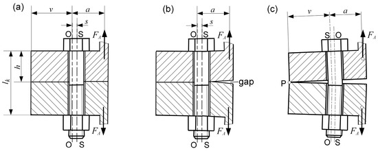 The linear theoretical relationship is valid as long as a compressive load occurs on the entire contact surface of the flanges (Figure 6a). Due to the eccentricity of the working load, the pressure on the side from which the working load is applied decreases as the working load increases. When a gap forms between the flanges (Figure 6b), the relationship between the working load and the additional bolt load is no longer linear. From the point when only the edge point is in contact (Figure 6c), the additional force can theoretically be determined from the equilibrium equation for the lever. The axis of the bolt is denoted by S-S, the axis of symmetry of the pressure zone by O–O, the eccentricity of the bolt axis with respect to the axis of the pressure zone by s, and the eccentricity of the working load with respect to the axis of the pressure zone by a. The design of the joint should aim to minimise the value of a and maximise the value of v. The characteristic of the joint also depends on the flange thickness h.