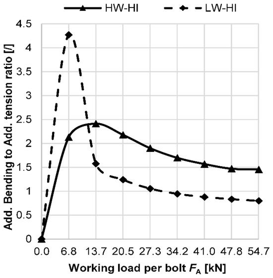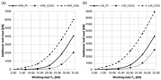 Since not all parameters required for an analytical study can be determined precisely, the finite element method is increasingly being used to determine the fluctuating load on a bolt. The studies of many authors [37,38,39] show a progressive relationship between the additional load on the bolt and the working load. In most studies, the results of the numerical analyses were verified by measuring the forces on the bolts. The results of our study [27] for the flange joints shown in Figure 5 are shown in Figure 8. The additional load on the bolt is negligible at low working loads, regardless of the design. As the working load increases, the additional load on the bolt increases progressively. The symbols in Figure 8 indicate HW = high washer, LW = low washer, and MB = modified bolt. The modified bolt differs from the standard bolt since its diameter is reduced to 16 mm. It can be seen from Figure 8 that the additional load on the bolt can be significantly reduced by using a high washer.