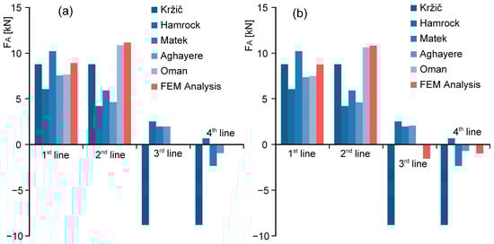 For circular flanges, the working load per bolt is determined based on the normal stress in the pipe. The circumference of the pipe is divided into several segments, each of which is connected by a bolt. The working load per bolt is the product of the stress in the segment and the area of the segment. This model is used by researchers working on flange joints in wind turbine towers [37,38,39]—it is called the segment model. In wind turbines, the bolts are located on the inside of the tube (L-segment) and are not visible from the outside. Large-diameter joints can also be constructed with flanges bolted on both sides of the tube. In this case, there are two bolts in each segment (T-segment) so that the working load on each bolt is half the load on the segment. A more accurate, but also more complex, calculation of bolt loads in round flanges is described in [48,49]. An example which shows the precision of different established methods to define the working force distribution in case of I-Beam cantilever beam is shown in Appendix A.3 (see Figure A3 and Table A3).
