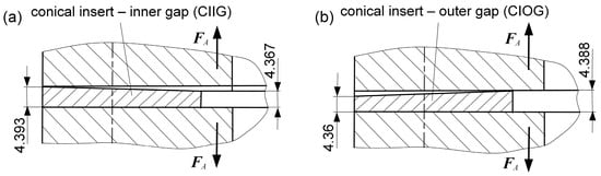 In our research [71], we have investigated the influence of geometric imperfections on the additional load in the bolt for small flanges. Experimental and numerical investigations confirmed the tendencies observed in large flanges. We studied the two flange joints shown in Figure 5. Using inclined/conical inserts, we simulated a gap between the flanges (Figure 15) of only 0.02 to 0.03 mm. The study showed that even minimal flange unevenness, which is always present without special precision machining, significantly affects the conditions in the bolted joint considerably. The results of the measurements are shown in Figure 16. The joints were also analysed using the finite element method and comparable results were obtained.